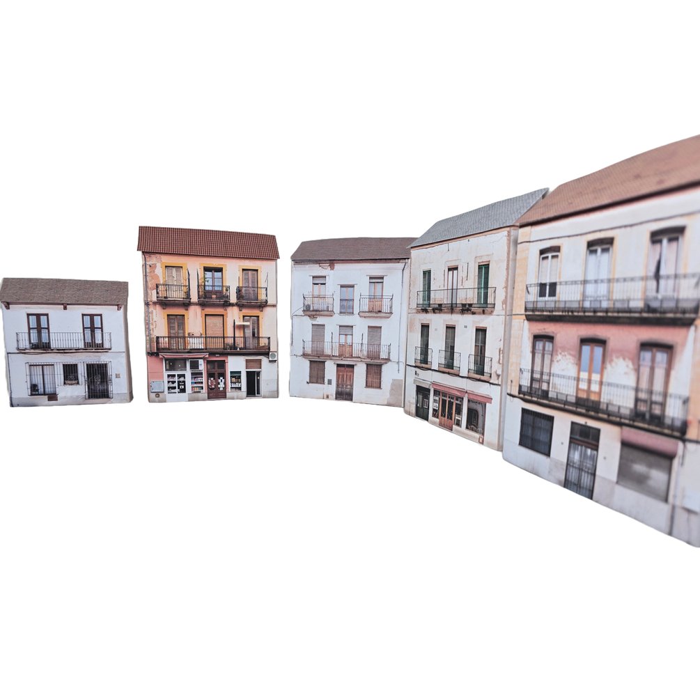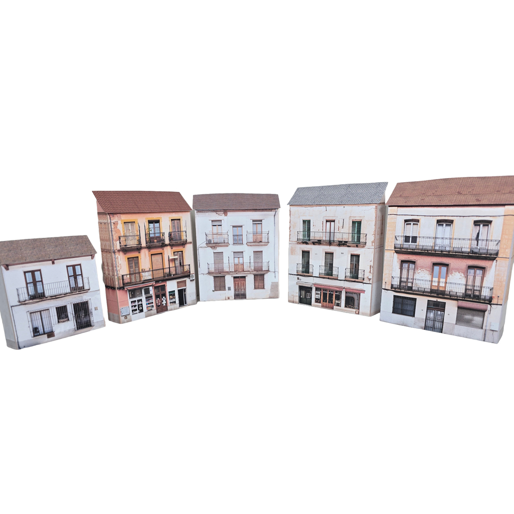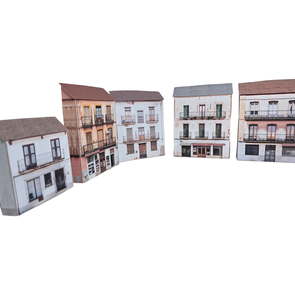 Transform your layout with authentic Mediterranean character using this set of five printable low-relief Spanish-style buildings. Inspired by traditional townhouses and shopfronts found across Spain, these models feature photo-realistic textures that capture the warmth and charm of Spanish architecture, and can be resized to any scale with our easy-to-follow resizing guide.