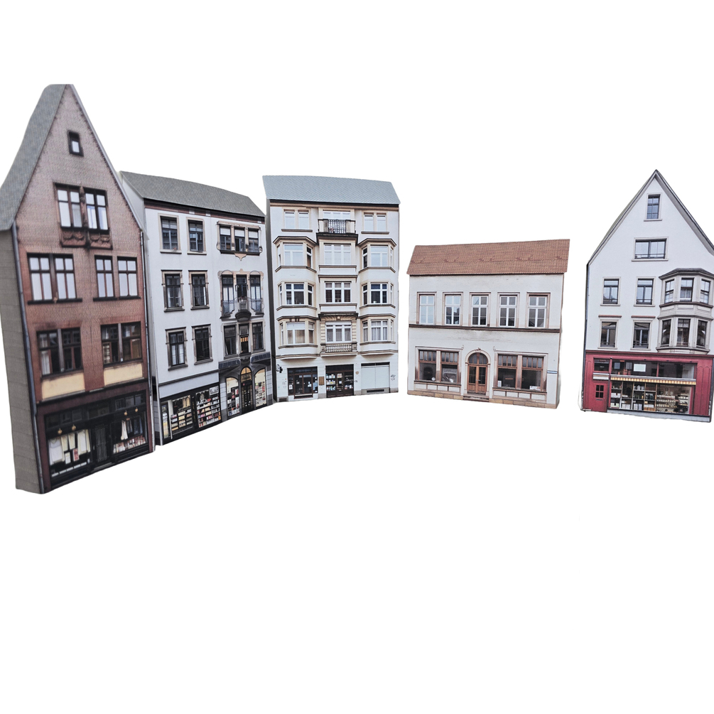 Bring a touch of the authentic European charm to your layout with this set of five printable low-relief German-style buildings, inspired by traditional German townhouses and shopfronts, these detailed façades add character, height, and atmosphere to urban scenes. With photo-realistic textures and distinctive architectural charm, these models can be resized to any scale using our simple, step-by-step resizing guide.