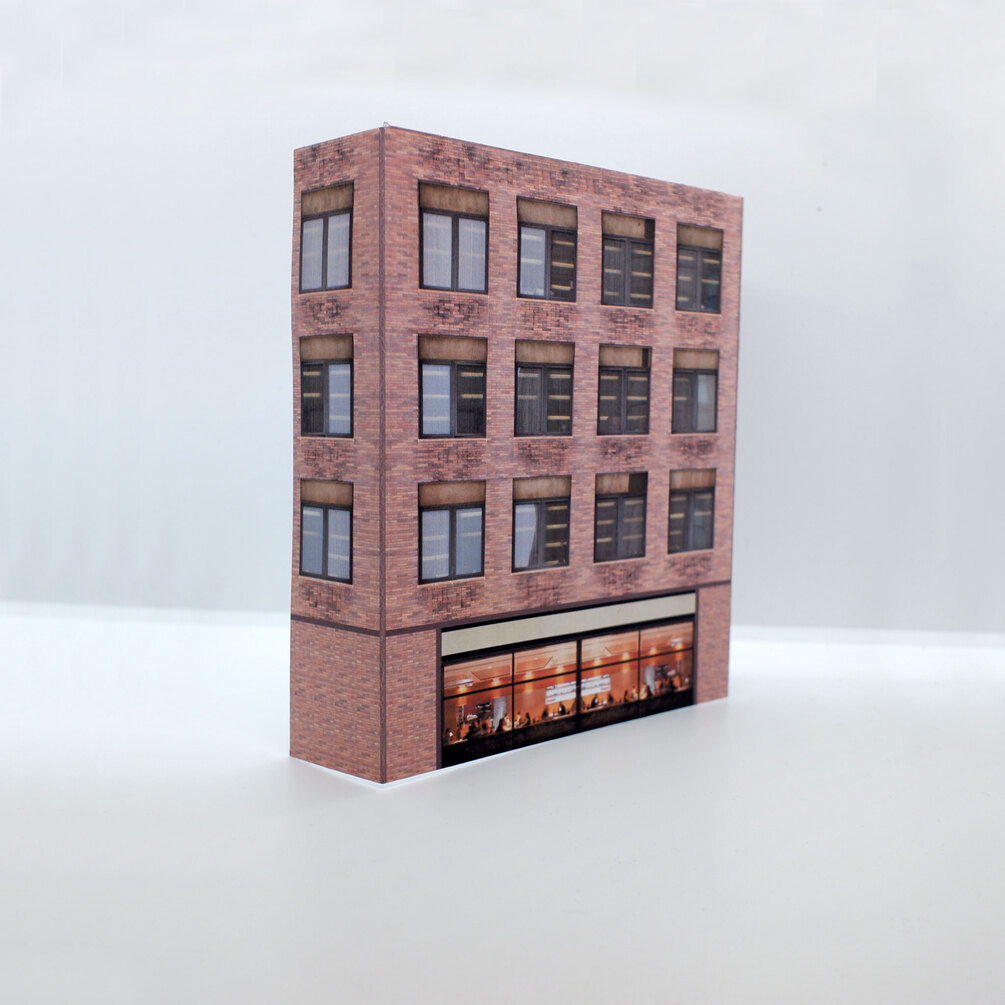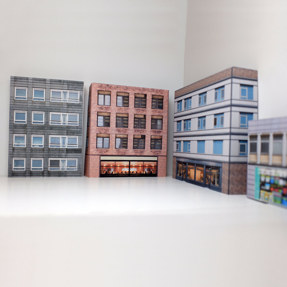 Create a bustling high-street atmosphere for your model railway with these downloadable low-relief town buildings, designed for easy printing, cutting, and assembly.