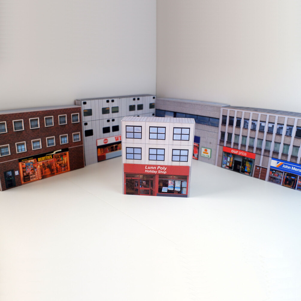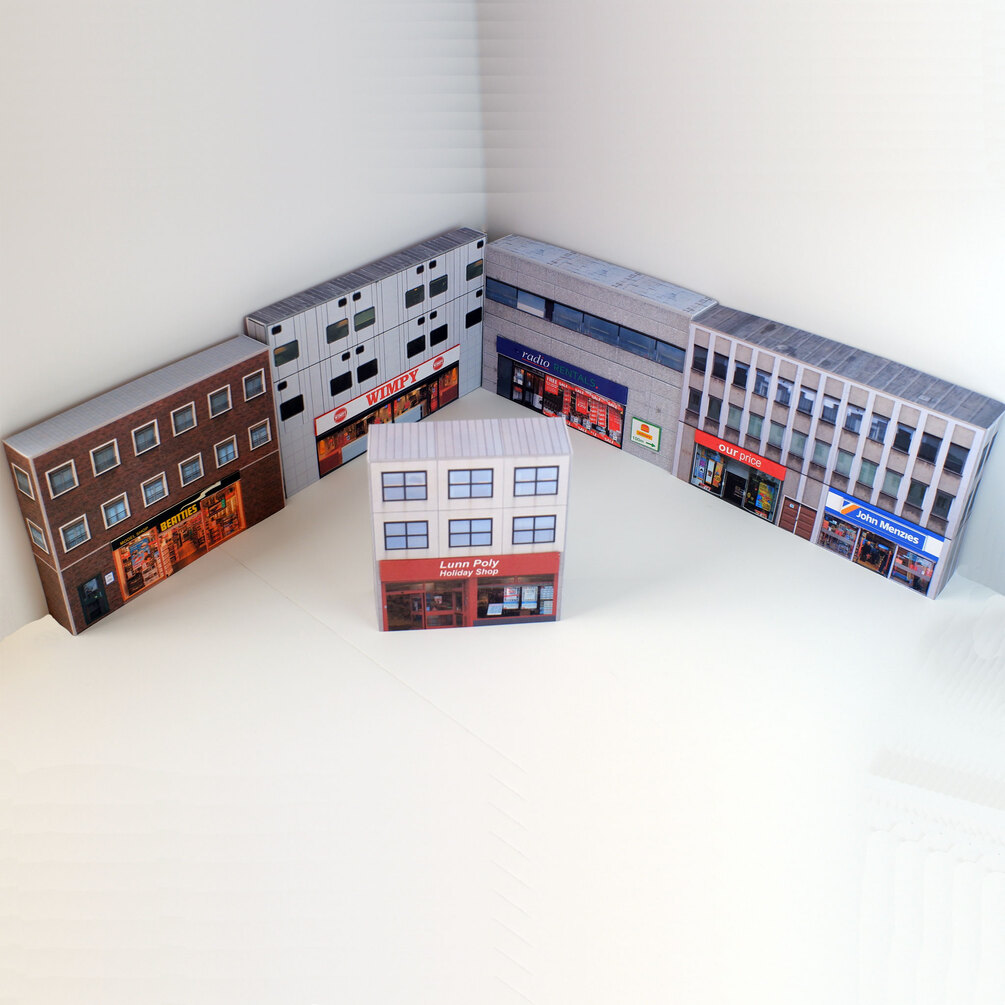 Step back in time with this downloadable pack of printable retro shop buildings, perfect for recreating the charm of 1980s and 1990s high streets on your OO gauge model railway layout!